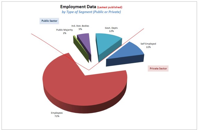 1.7 Full-Time Employment as at end August 2025Full-time employment as at end August 2025 stood at 298,738 persons - 280,552 employed in Malta and 18,186 employed in Gozo. 82% of full employment is recruited by the Private sector while the remaining 18% are recruited in the Public Sector. The total number of self-employed persons have an 11% share of full-time employment. The largest share of employment (21.5%) is recruited within the Wholesale and Retail; transportation and storage; information and Communication, followed closely by the Public Administration, Defence; Education; Human Health and Social Work activities sector at 20.6% and by the Professional, scientific, technical, administration and support service activities sector at 20% . |