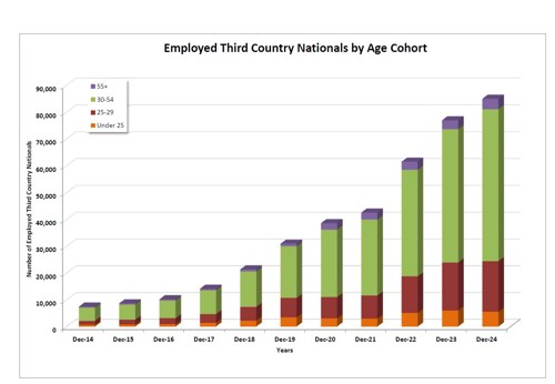 3.2 Employed Third Country Nationals by Age Cohorts (2014-2024) Employed Third Country Nationals are segmented as 67% males and 33% females. 67% of all Third Country Nationals are aged between 30-54 years; followed by 22% in the 25-29 age cohort. Over the period under review, all the age cohorts have been increasing as the influx of TCNs increased. |