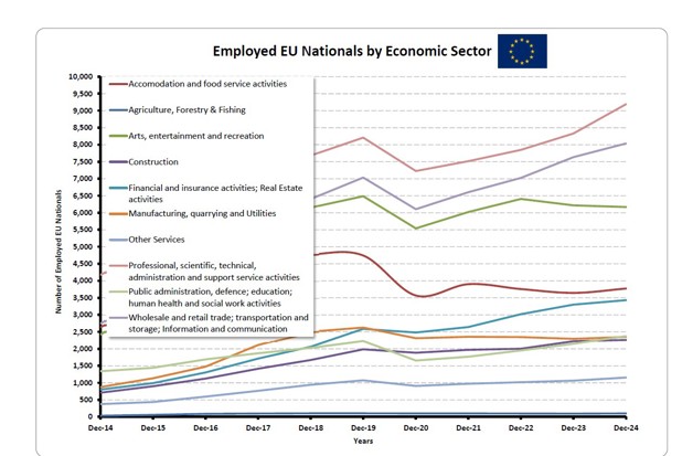 EU nationals are mainly employed (24%) in the Professional, Scientific, Technical, Administration and Support Service Activities sector; followed closely by the Wholesale & Retail Trade; Transportation & Storage (21%); the Arts, Entertainment and Recreation sector (16%); and the Accommodation and Food Services Activities sector (10%). |