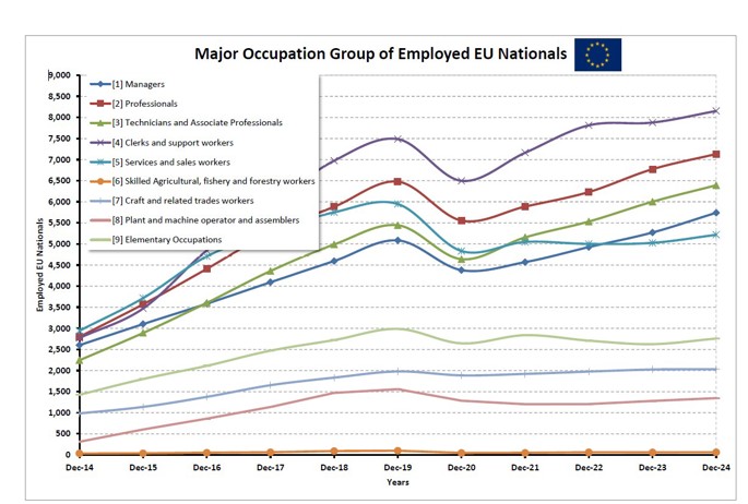 2.4 Employed EU Nationals by Main Occupation Group (2014-2024) EU nationals are mainly employed in occupations relating to the top five major groups of the ISCO-08 coding, namely: Clerks and Support Workers (21%); Service and Sales workers (13%); Professionals (18%); Managerial grades (15%); and Technical and Associate Professional Groups (16%). Over the past decade, these five major occupation groups have varied in their shares of total EU nationals employed in Malta and Gozo. |