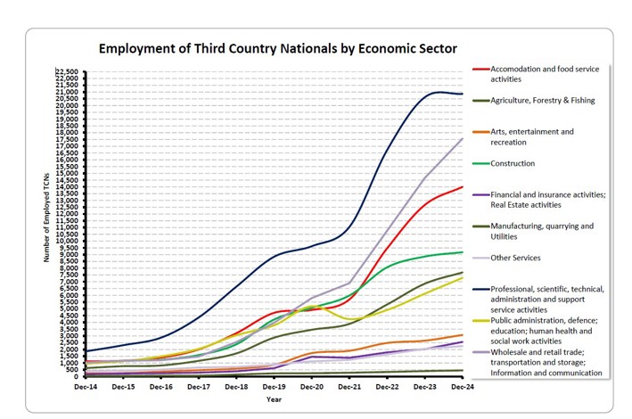3.3 Employed Third Country Nationals by Economic Sector (2014-2024) Third Country Nationals are mainly employed (25%) in the Professional, Scientific, Technical, Administration and Support Service Activities sector; Accommodation and food service activities (16%); Public Administration, Education, Human Health and Social Work Activities sector (9%); Construction (11%); and the Wholesale & Retail Trade; Transportation & Storage; Information & Communication sector (21%). |