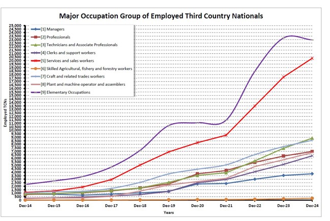 3.4 Employed Third Country Nationals by Main Occupation Group (2014-2024) Over one third of Third Country Nationals are mainly employed in jobs relating to Elementary occupations (27%). The next major occupation groups in which TCNs are mainly employed include Service and Sales workers (24%); Craft and related Trade Workers (10%); Technical and Associate Professionals (10%); and in Professional grades (8%). |
