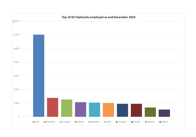 In the following tables, EU Nationals will include: (a) those persons originating from EU Member States including their dependents who could be third country nationals; and (b) those persons who originate from EFTA countries and who therefore can be employed like EU Nationals based on the conditions agreed with the EU. 2.1 Top 10 Nationalities of Employed EU Nationals (as at end Dec 2024) The following illustration provides the top 10 employed EU nationalities as at end December 2024.