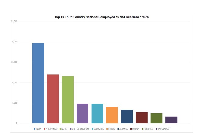 3.1 Top 10 Nationalities of Employed Third Country Nationals (as at end Dec 2024) The following illustration provides the top 10 employed Third Country Nationals as at end December 2024. As one can notice from the below illustration, the top three nationalities who have been increasing gradually over the period under review are persons originating from India, Philippines and Nepal. |