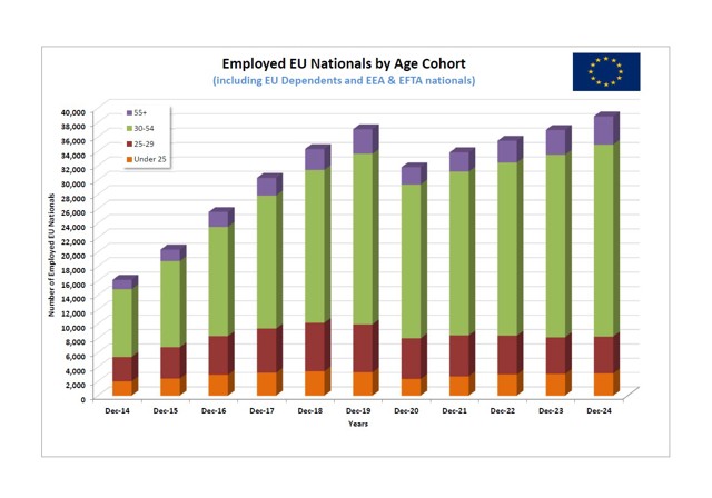 2.2 Employed EU Nationals by Age Cohorts (2014-2024) Employed EU Nationals are segmented as 58% males and 42% females. 69% of all EU nationals are aged between 30-54 years; followed by 13% in the 25-29 age cohort. Over the period under review, all the age cohorts have been increasing as the influx of EU nationals increased.